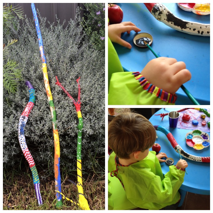 Big Daddy took Master C and Baby J on a nature walk to our local coastal park and returned with a boot full of driftwood, pinecones and sticks for us to get stuck into. I selected three long pieces of driftwood for this project and primed them the night before setting them out for Master C the next day. This was a multi-stage process as I needed to let the primer dry on one side before flipping the stick over and priming the opposite side. The next day, I set out one colour of paint and a thick brush and let Master C have at ‘er (we used acrylic paints from our local $2 shop). He mainly painted in long chunks before moving on to painting his hand (hahaha). Later that night I filled in the colour where he had painted, covering all areas that were still white and adding more colour as necessary. The following day I presented him the sticks again and gave him a finer brush and guided him to paint only in certain sections (“can you paint only on the red bits?”). He added accents in a few colours and was ready to get on to the next thing. These kinds of bite-sized arts and crafts sessions are more his speed. I added accents to my own stick and the next day I propped up all three in the garden. They have jazzed up our deck and brought more colour to our yard and also have become a well loved tool in Master C’s backyard play. For anyone who has ever read Elsa Beskow’s beautiful story Children of the Forest, you will understand Master C’s obsession for wielding a giant spear in search of Vara the Viper. 🙂