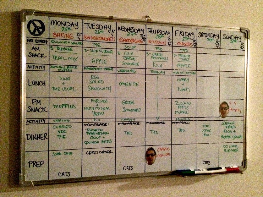 Aside from meal swap, there are a few other small measures I have put in place in an effort to take the pressure off myself as mother and therefore predictor of our family’s overall mood and emotional wellbeing. I know that I am a MUCH better mum on the days when I am calm, organized and unhurried. I have a big ugly white board in my kitchen that keeps me organized for the week, specifying which activity/craft/task I am undertaking each day with the kids, what snacks we will have and which meals that we will eat. I have plans to make this board less ugly and more Waldorfy in the near future (watch this space). But despite it’s ugly, it is really very helpful to me. A bit OCD? Perhaps. But, hey, it works for us.