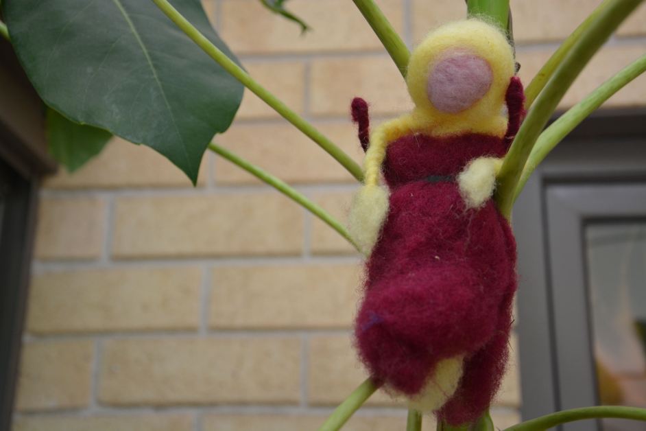 My first felted fairy was made on my first day at our local Steiner playgroup nearly a year ago now. I admit that I had no idea what I was doing other than trying to copy what the other mums were doing around me. The result was a fairy with hair growing from her neck somehow, wearing a gown that did nothing to improve her appearance. Nonetheless, one had to start somewhere and “Neck Hair Fairy” has lived since that day perched in a tree on our back deck. It’s all about the journey, folks! Since that time I have been wise to pursue a bit of instruction (Thank you YouTube!) and the results have improved significantly.