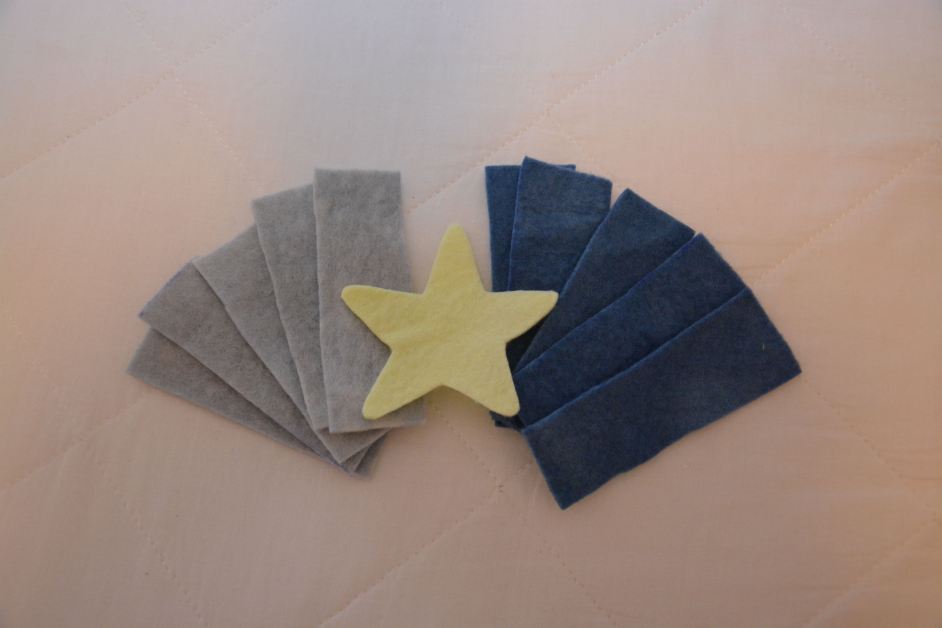 Print this PDF pattern twice ( We Do Waldorf Birthday Crown pattern FREE ), cut out and tape together along the midline, then trace pattern onto both the Sulphur Yellow and the Sarsaparilla felt sheets, and cut out. Cut out 5 rectangles that are each 9cm x 3 cm in both the Tasman and the Apollo Bay. Cut out a star shape from the excess Sulphur Yellow, approximately 8 cm in diameter.
