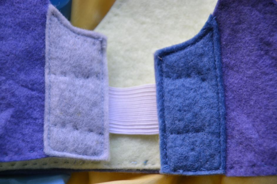Flip the whole thing over and trace with a pen along the excess where the rectangle pieces extend past the edges of the crown. Cut to remove excess. Flip back over and, with machine (or by hand), sew in each rectangle. Once all pieces are attached, hand sew your star in the centre. Pin the blue and the yellow crown pieces together, so that the elastic is sandwiched in between the two.